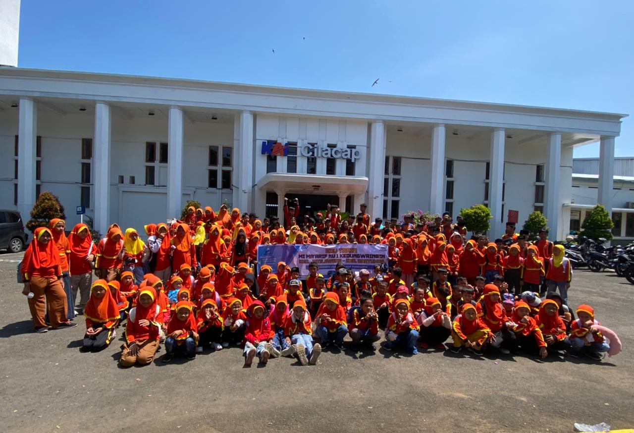 Minggu/19/04/2026 pengalaman baru yang  diikuti oleh siswa kelas 1 sampai kelas 6 MI Maarif NU 1 Kedungwringin, guru dan beberapa wali murid dengan total keseluruhan lebih dari 250 peserta.  EduTrain adalah kegiatan belajar di luar kelas yang menggabungkan edukasi dengan perjalanan. Dalam kegiatan ini, siswa tidak hanya belajar teori, tetapi juga melihat dan merasakan langsung pengalaman di lapangan, sehingga pembelajaran menjadi lebih nyata dan menyenangkan. Kegiatan Edutrain dimulai pukul 07.00 WIB. Peserta kegiatan edutrain berkumpul di sekolah. Mereka datang dengan penuh semangat dan antusias karena akan mengikuti kegiatan belajar di luar kelas. Setelah semua siap, rombongan MI Maarif NU 1 Kedungwringin berangkat menuju Stasiun Purwokerto menggunakan 5 bus yang sudah disediakan. Rute perjalanan Edutrain pada kesempatan kali ini yaitu dari stasiun Purwokerto menuju stasiun Cilacap, dan kembali lagi ke stasiun Purwokerto.